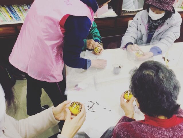オレンジポマンダーの説明がどこまで皆さんの頭に入ったかはさておいて、作業に入ると先ほどまでのざわめきが嘘のように真剣に、ひたすらクローブを刺す😉