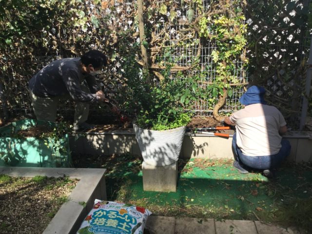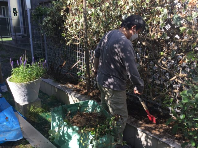 ちょっと手付かず状態だった花壇に張った根や茎をとり除き、ご用意した苗たちを配置しました。