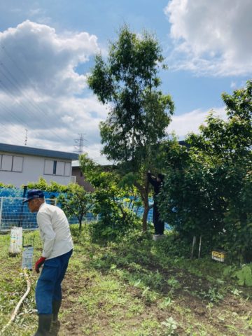 院長、院長の父と私の3人で畑に植えたユーカリの剪定
