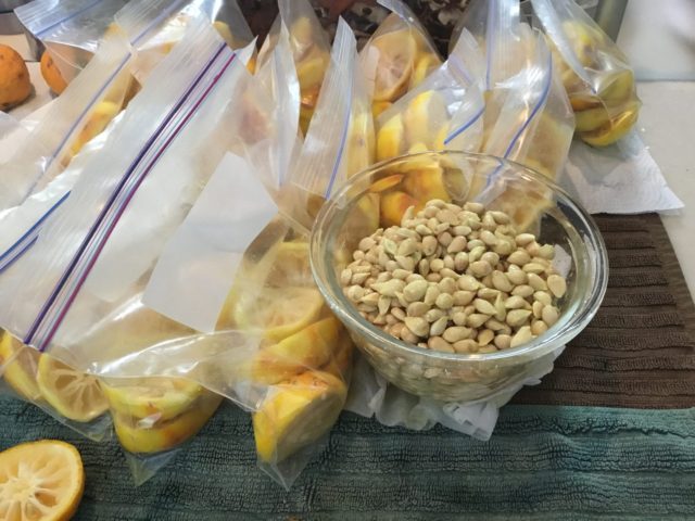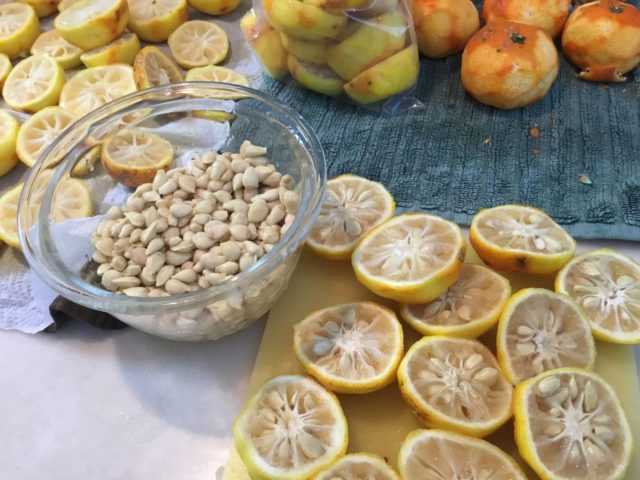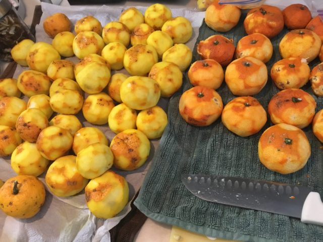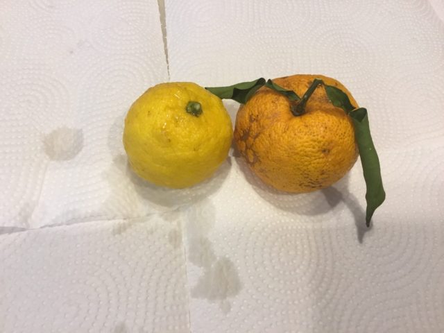 皮を剥がれた無残な姿(左側が自家製柚子、右側は自家製みかん)。 ですが、ここからまだまだ 次は柚子の種