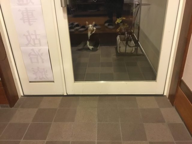 おやおや!?玄関に誰かいますよ。 ニャンとも言えない後ろ姿!!シャッターの音に、振り返って、お顔が見えました!