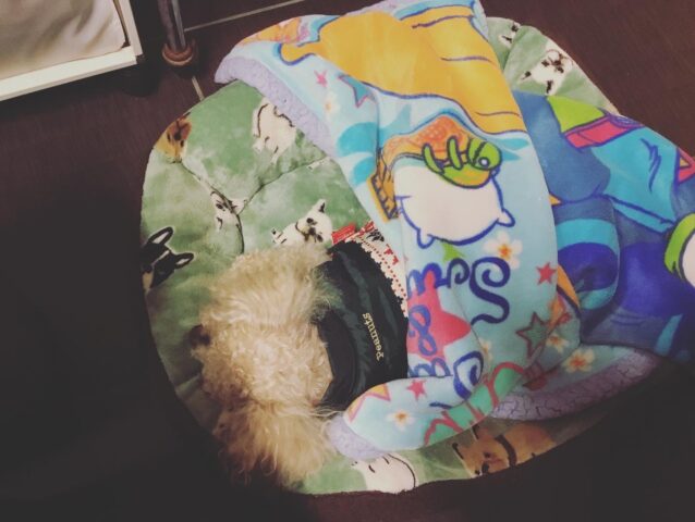 トリートメントが終わり、お客様がお着替えしてアフターハーブティーを飲んでいても、まだ夢の中のアレグロくん🐶