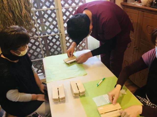 大工さんの代わりに院長が石鹸置きづくりを指導