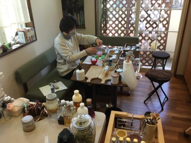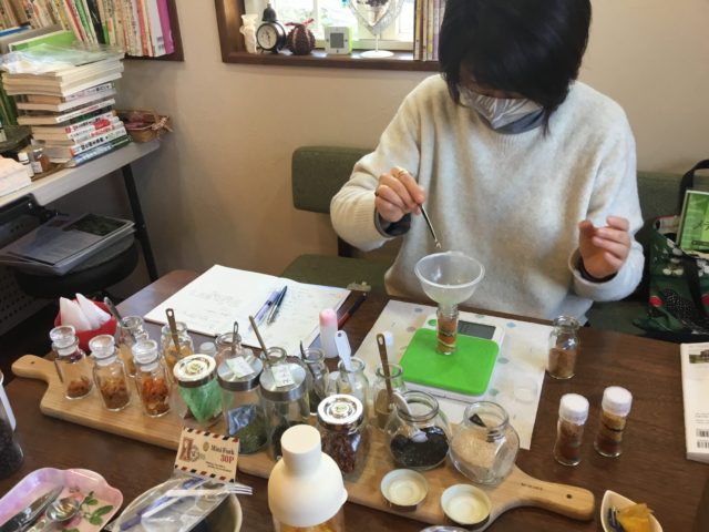 はじめての冬のお守りティーづくりに挑戦し、「ここぞという時に飲むんですね」と楽しく調合。